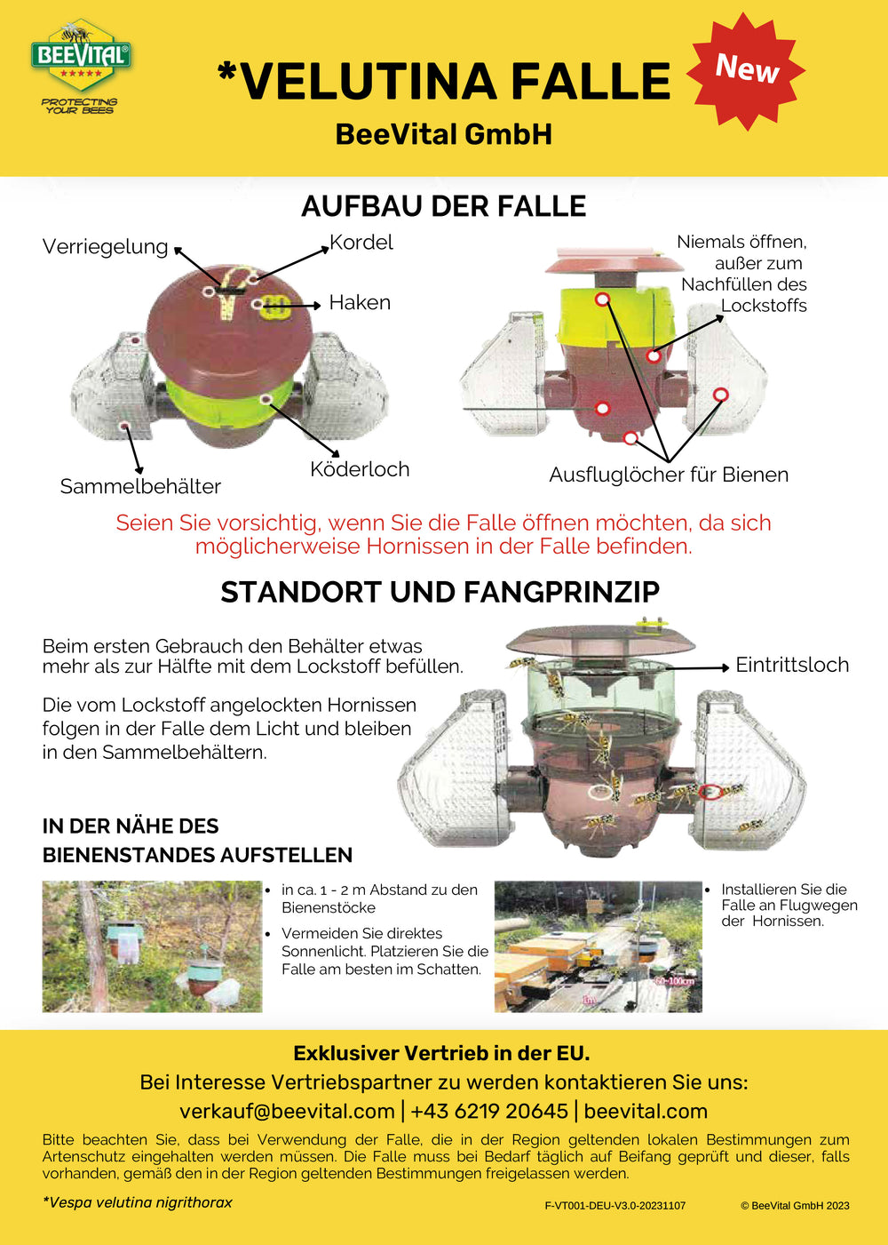 Wichtiger Hinweis: Beim Einsatz der Falle müssen die lokalen Artenschutzbestimmungen stets eingehalten werden. Eine tägliche Überprüfung auf unbeabsichtigten Beifang ist erforderlich. Falls sich geschützte Insekten verfangen, sind diese gemäß den regionalen Vorgaben umgehend freizulassen.