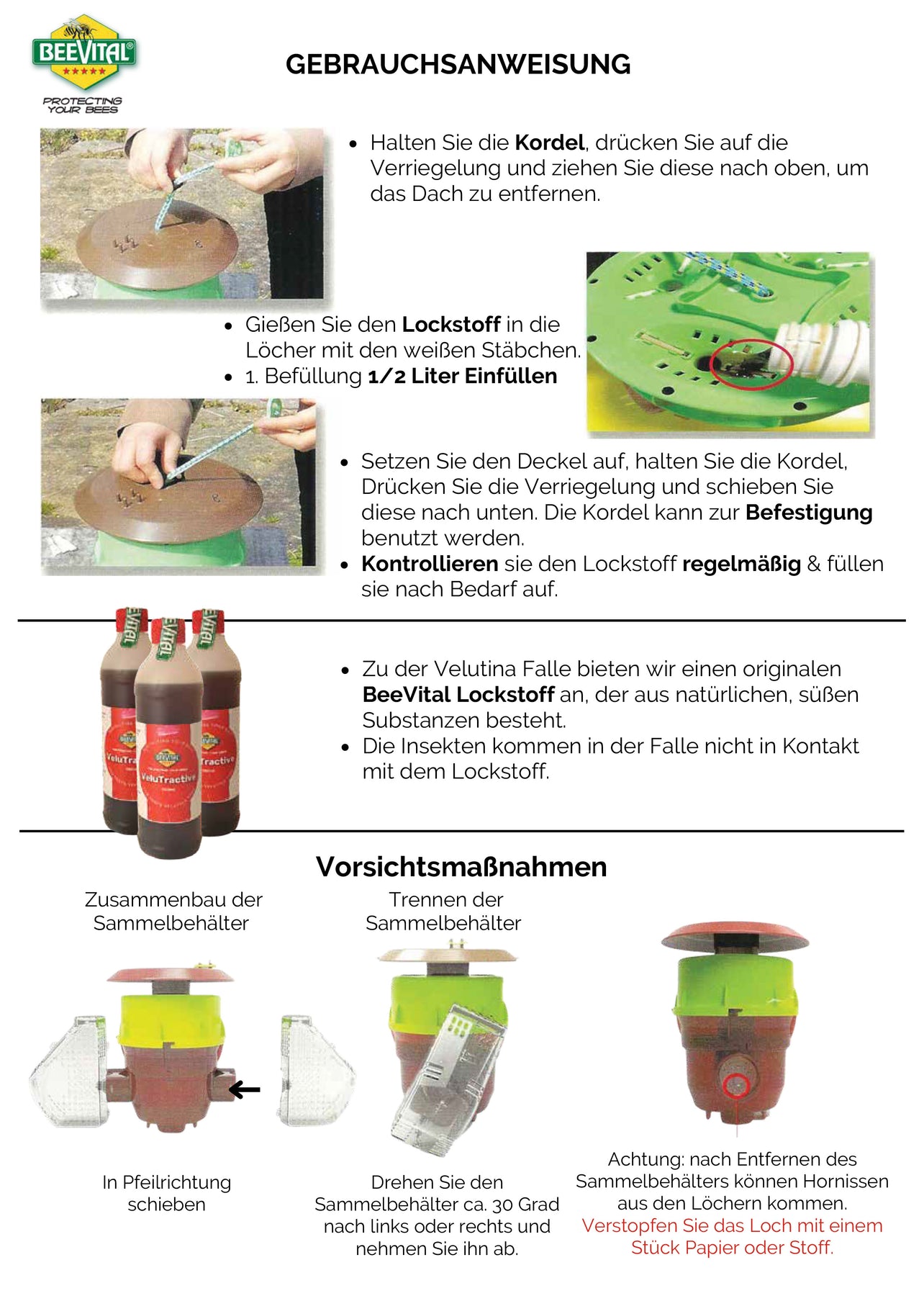 Mit der VelutinaFalle sichern Sie Ihre Bienenstöcke vor der Asiatischen Hornisse (Vespa velutina). Der speziell entwickelte Lockstoff zieht die Hornissen an, die anschließend dem Licht in die Falle folgen und in den Sammelbehältern verbleiben.